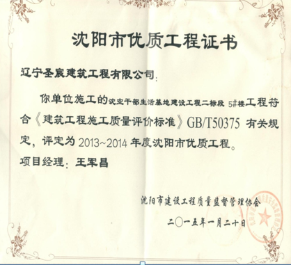 沈空干部生活基地建設(shè)工程榮獲2013年-2014年度“沈陽(yáng)市優(yōu)質(zhì)工程”稱號(hào)