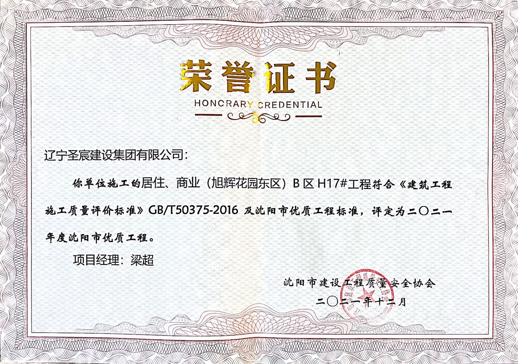 2021年度沈陽市優(yōu)質(zhì)工程-(旭輝花園東區(qū))B區(qū)H17#