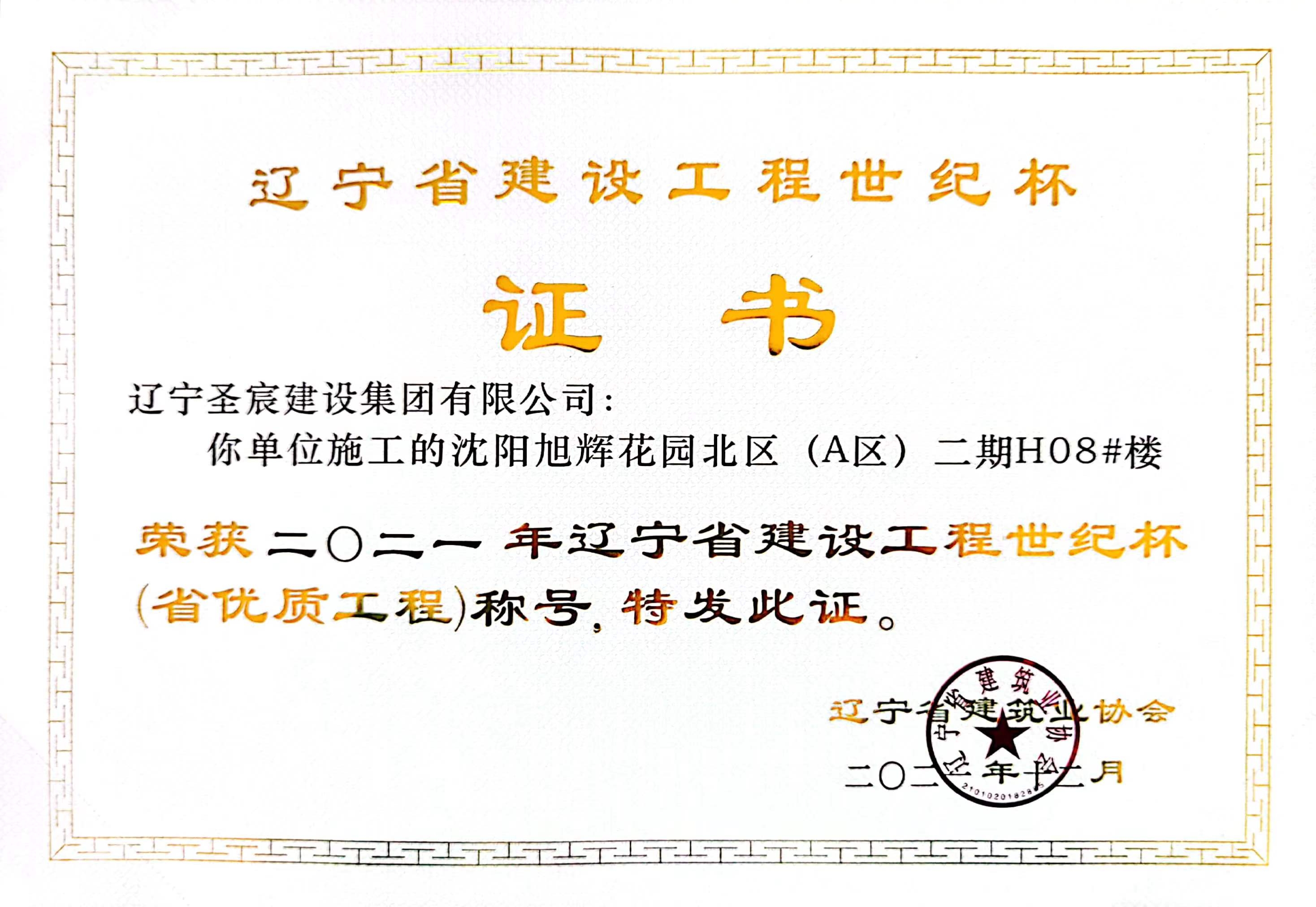 2021年遼寧省建設工程世紀杯(省優(yōu)質(zhì)工程)獎杯-旭輝花園北區(qū)(A區(qū))二期H08#