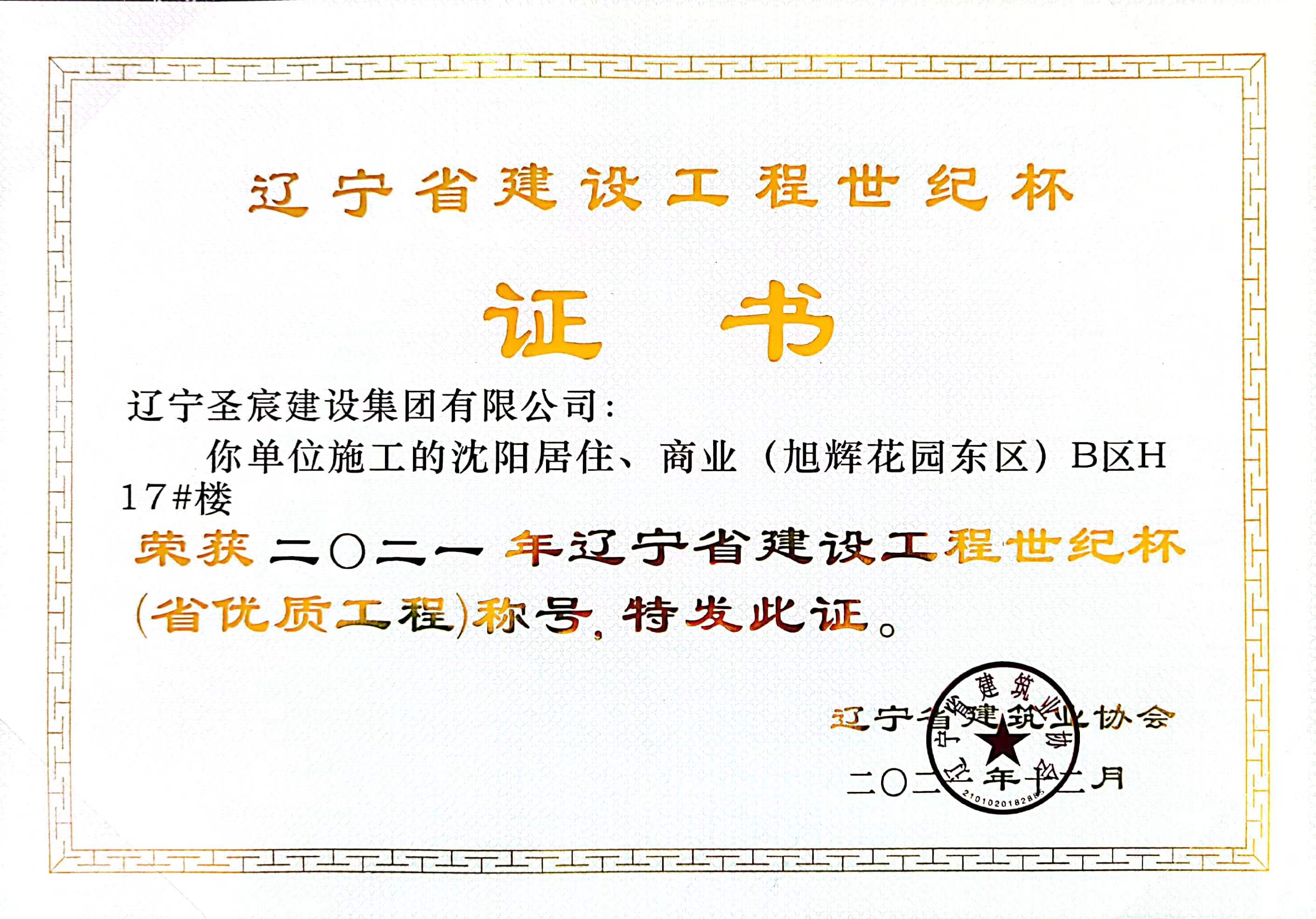2021年遼寧省建設工程世紀杯(省優(yōu)質(zhì)工程)獎杯-旭輝花園東區(qū)(B區(qū))H17#