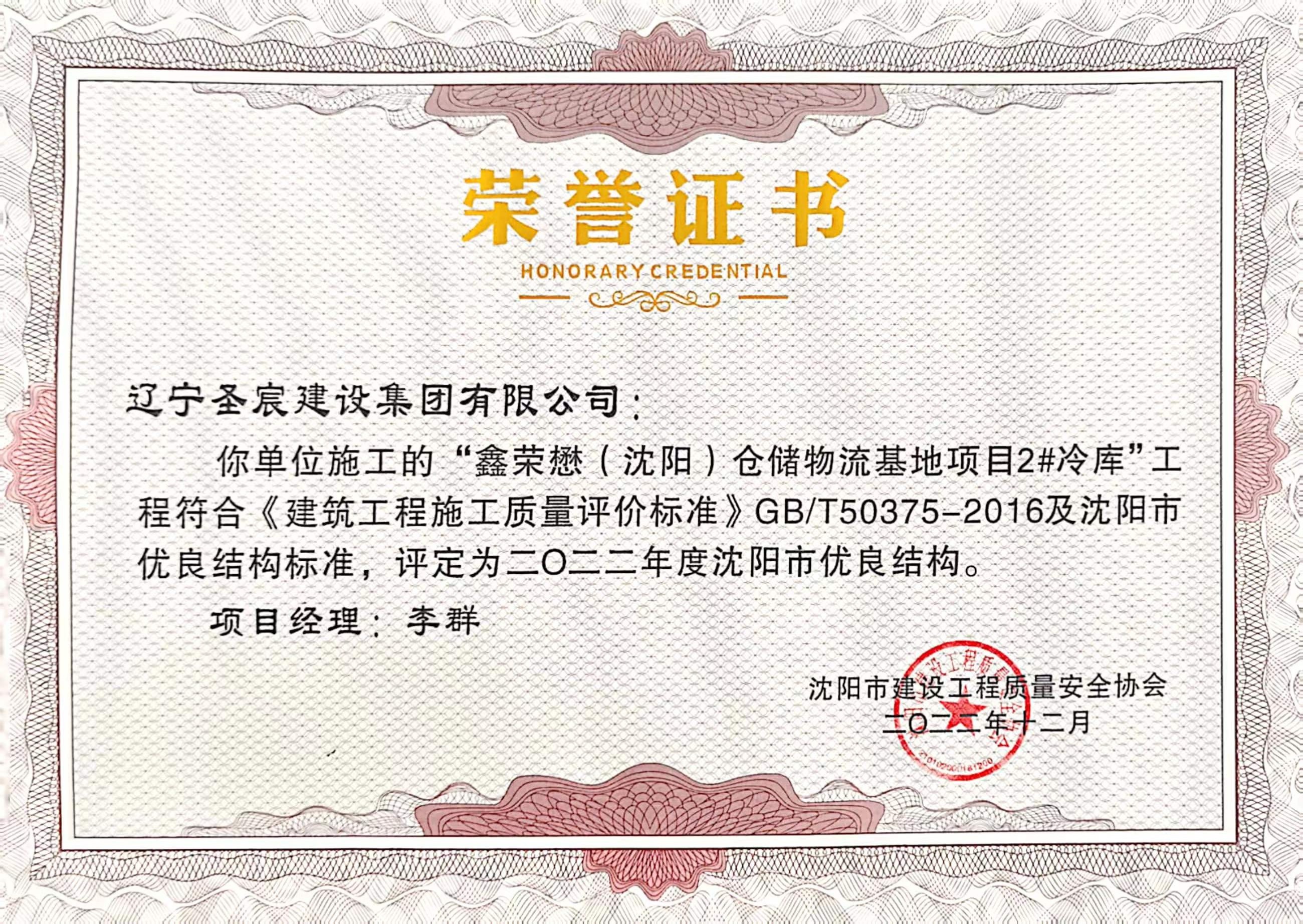 2022年度沈陽市優(yōu)良結(jié)構(gòu)-鑫榮懋(沈陽)倉儲冷鏈物流基地項目1#冷庫